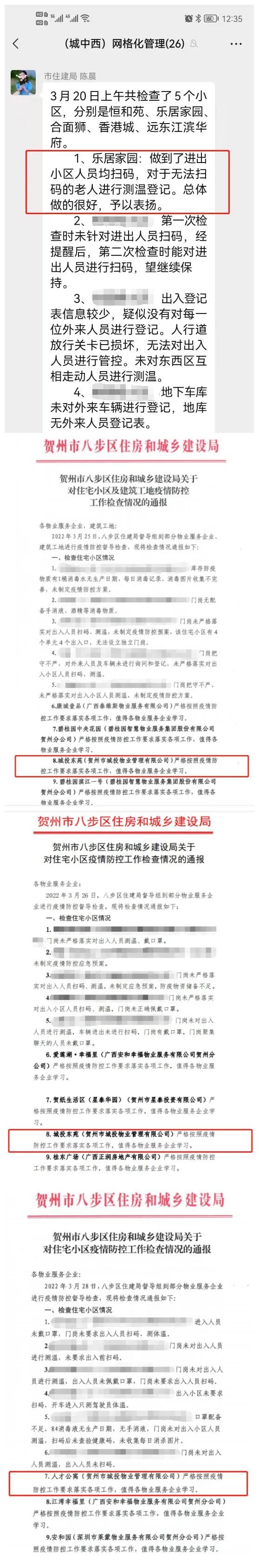 近日,賀州市住建局、八步區住建局到所管轄物業服務企業進行疫情防控督導檢查,城市運營公司下屬賀州市城投物業管理有限公司管理的人才公寓、樂居家園、城投東苑等小區獲得通報表揚。